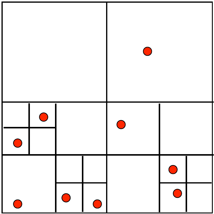 因为Quad-Trees存在诸多变种,为了有所区分,上面提到的最简单的这种Quad-Tree,被称之为Point Quad-Trees。还有一种典型的Quad-Trees,被称之为Point Region QuadTrees(简称为PR QuadTrees):