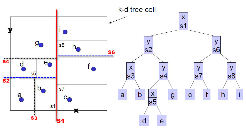 与Quad Trees思想类似,K-D Trees也是将整个区间进行不断分割,不同之处在于,Quad Trees每一次迭代,将一个区间分割成四个象限,而K-D Trees则是分成左右或上下两个区间。如上图所示:S1把整个空间分成了左右两个区间,左侧区间中,又被S2横向分割成了上下两个区间,而S3又在S2的分割基础上,将下部分分割成了左右两个区间,….