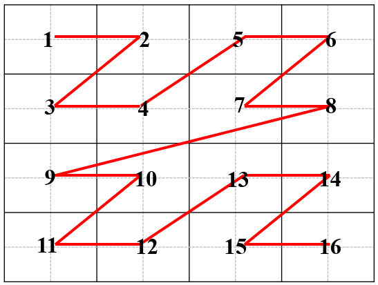 而后,将第一轮迭代中的每一个象限,再进一步细分成4个象限,这样共变成了16个区间。在第二轮迭代中,再将16一个小区间用Z-Order曲线连接起来: