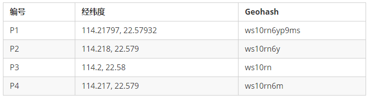 位置相近的点,生成的Geohash值也相似,如P2与P4,两者纬度相同,经度仅差0.001,在生成的Geohash值中仅最后一个字符有区别。