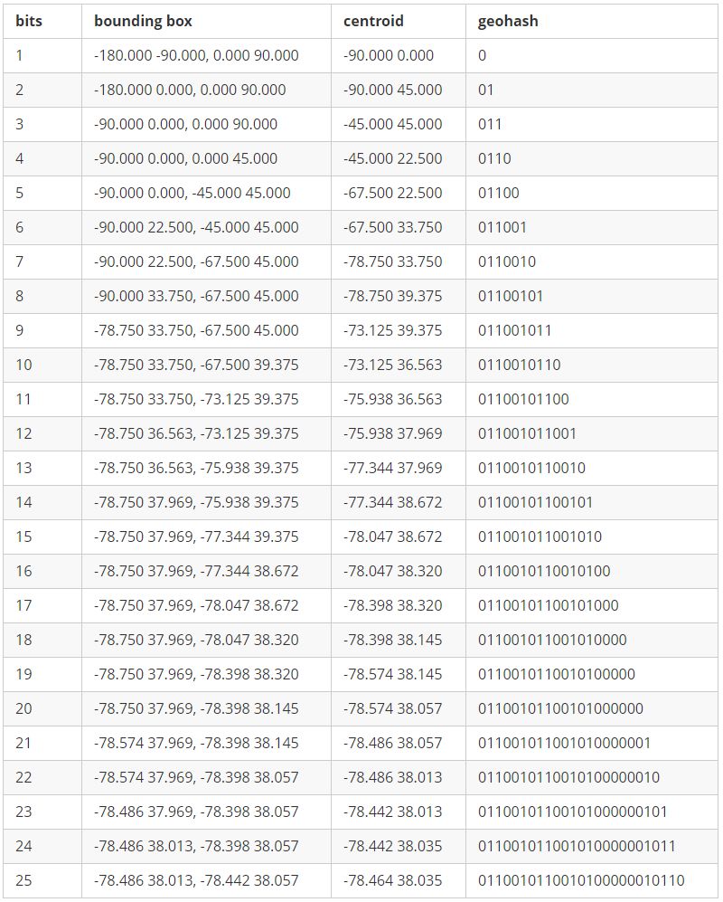 就这样,经度纬度不断交替二分迭代,每一步的输出结果如下表所示:
