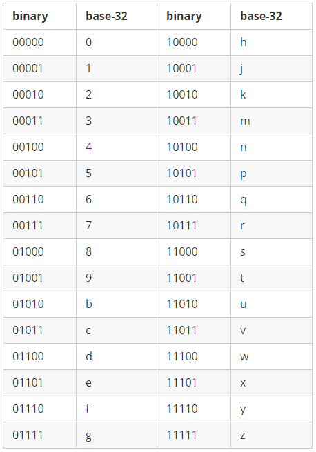 通过Base-32 Encoding,可以将上表中的编码结果进一步编码成字符串。例如,基于Base-32编码规则: