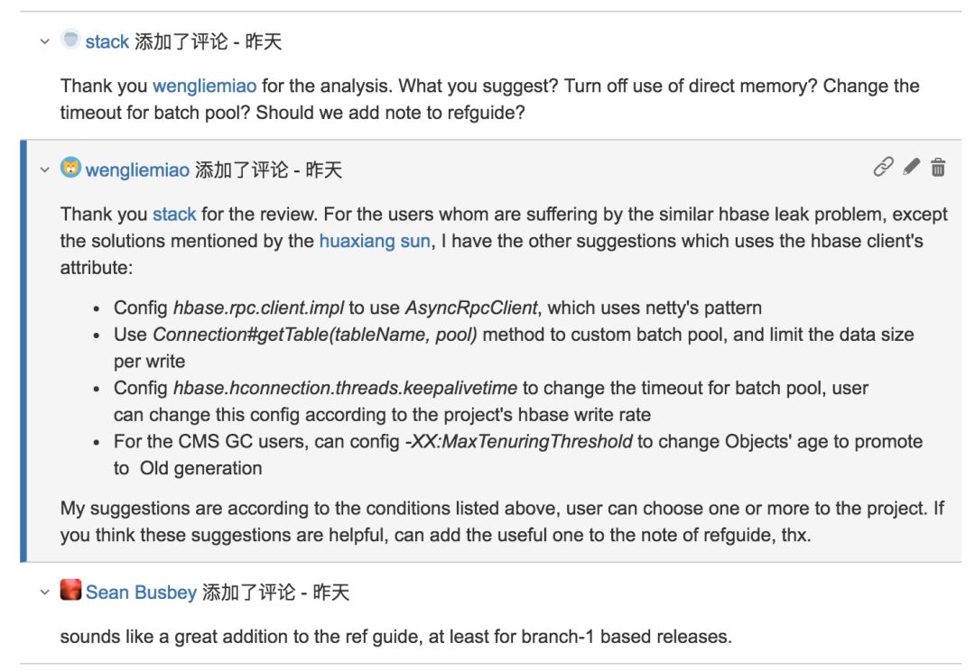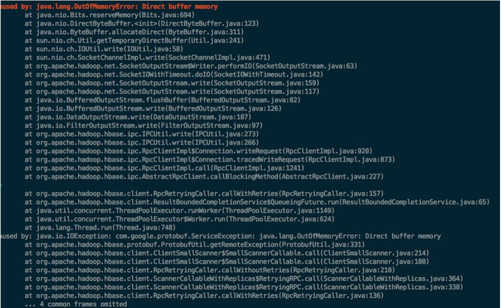 查找资料,发现 HBase 官方的 issue 列表里有一个堆外内存溢出的 case (hbase direct memory leak issue)。发现如果使用 JDK 的 HeapByteBuffer,在网络IO时,由于用户空间不能直接访问内核空间,因此会复制一个临时的 DirectByteBuffer 对象进行IO,且用 ThreadLocal 缓存该对象。如果使用多线程进行大数据量的网络IO,则可能导致内存溢出。