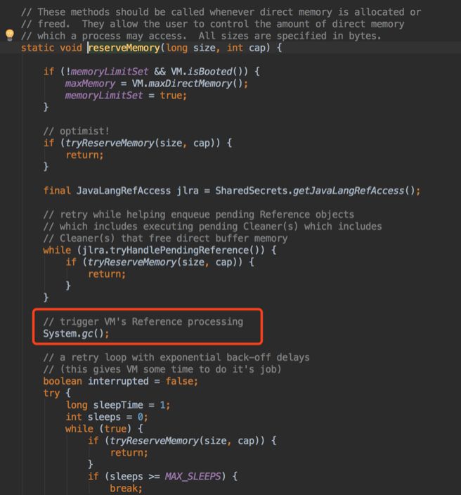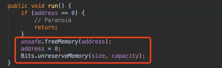 Cleaner 为 PhantomReference 的子类,在创建 DirectByteBuffer 对象时被创建。虚引用的作用在于跟踪垃圾回收过程,如果 GC 时发现一个对象的 GC Roots 只有虚引用,那么会将这个虚引用加入引用队列(ReferenceQueue),系统有个后台线程 Reference.ReferenceHandler 会从这个队列获取 Cleaner 对象,调用它的 clean 方法,释放资源: