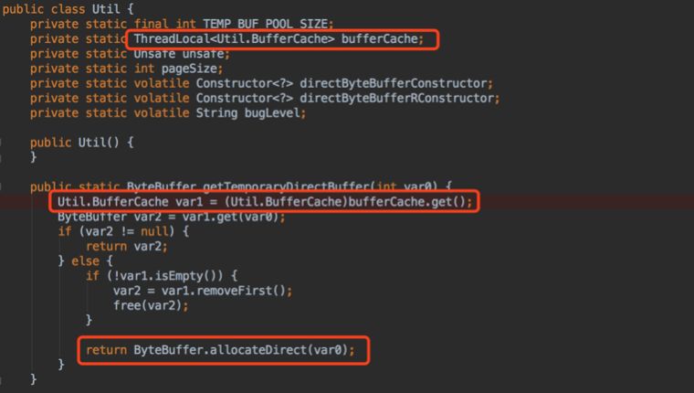 sun.nio.ch.Util 类会缓存堆外内存大小,且使用 ThreadLocal 方式: 引用由线程持有
