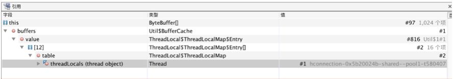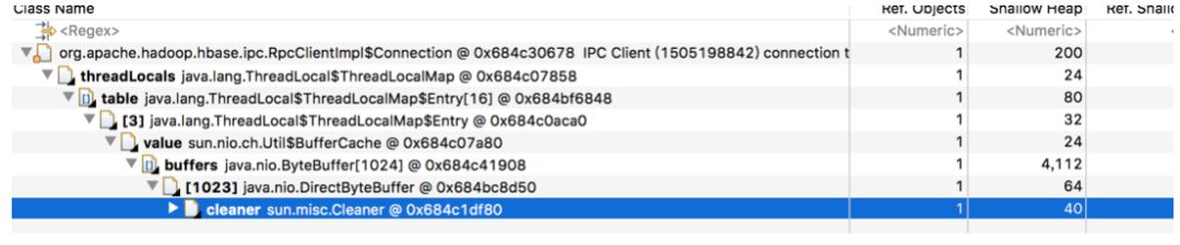 于是查看 HBase 源码,发现确实使用的是 HeapByteBuffer,使用 jVisualVM 查看 dump 文件中 java.nio.DirectByteBuffer 类的 GC Roots,发现是 HConnection 线程对象,而该对象在项目初始化时创建,并一直存活: