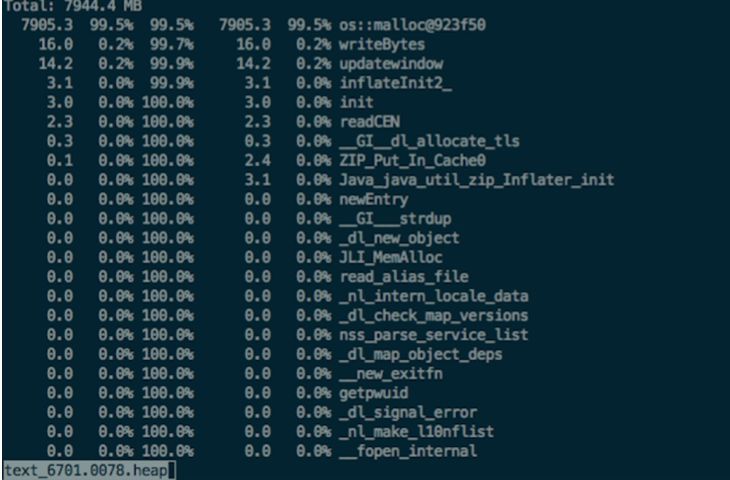 于是单独压测这两个接口,一次性读写10M左右的数据,并使用 gperftools 观察堆外内存占用。运行半小时出现溢出现象,观察 gperftools 文件,使用 malloc 分配堆外内存达到了 7900M: