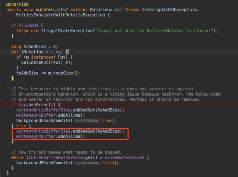 mutate 操作会将待写入的数据放到一个本地的 writeAsyncBuffer 缓存起来: