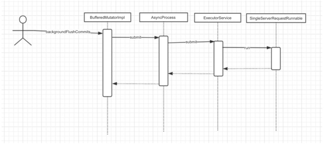 flushCommits 操作将 writeAsyncBuffer 中的数据写入到 HBase。这个过程中,HBase 把写入任务 SingleServerRequestRunnable 线程提交给线程池完成,调用方 wait 结果: