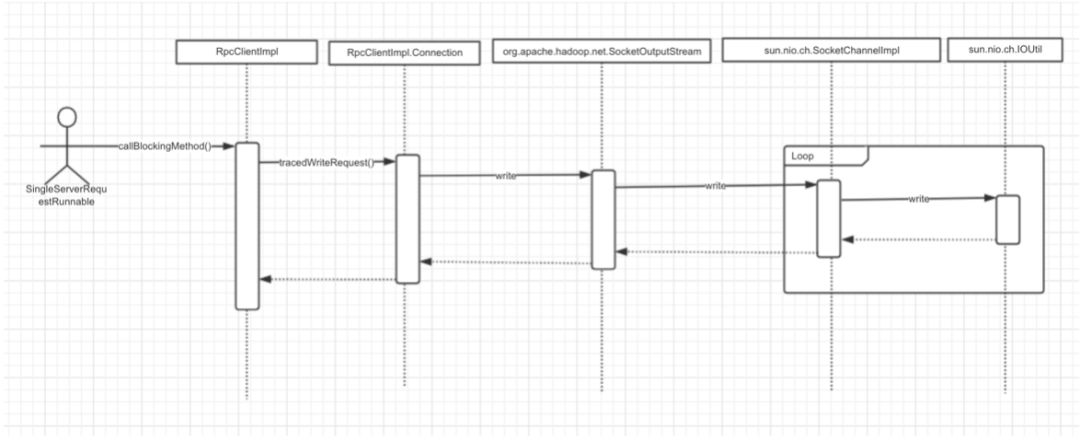 #call() 接口,在 RpcClientImpl#call 方法内被调用,向 HBase 发送读请求之前初始化 socket 连接,并启动 RpcClientImpl.Connection 线程,接收数据。其中发起请求流程和 HBase 写的流程一样:
