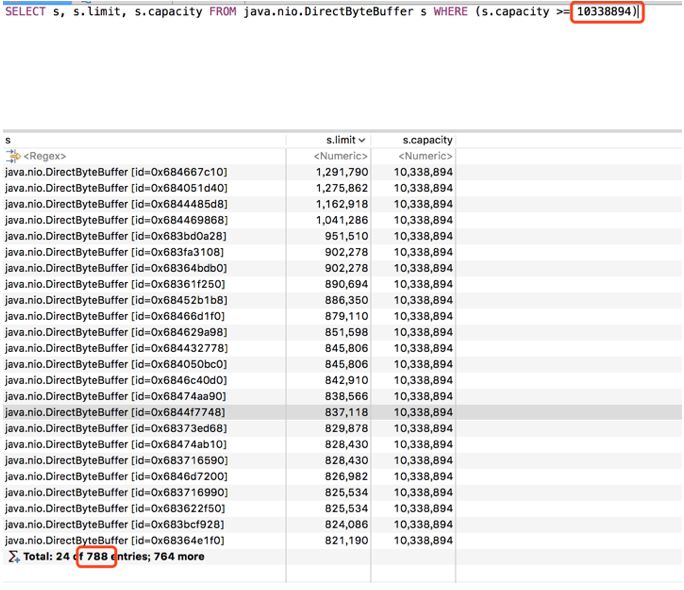到这里,可以确定 HBase 写会造成泄露,但目前造成泄露的内存量远大于前面分析的值。查看性能环境的 dump 文件,使用OQL 语句查看 java.nio.DirectByteBuffer 的数量和大小,发现占据 10M 空间的对象数量有 788个,总内存大约为=10338894*788=7800M: