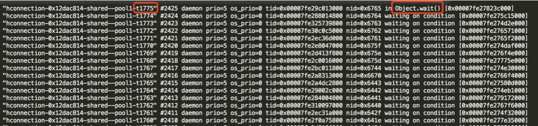 继续用 Jmeter 压测 HBase 写接口,并使用 jstack 观察 HConnection 线程的情况,发现以1s一个线程的速度进行写入时,HConnection 线程数保持在60左右,只有一个线程是活跃的,其他线程都是等待状态(waiting),且线程 count 数一直累加,说明进程一直在创建新线程并且一直有线程在消亡: