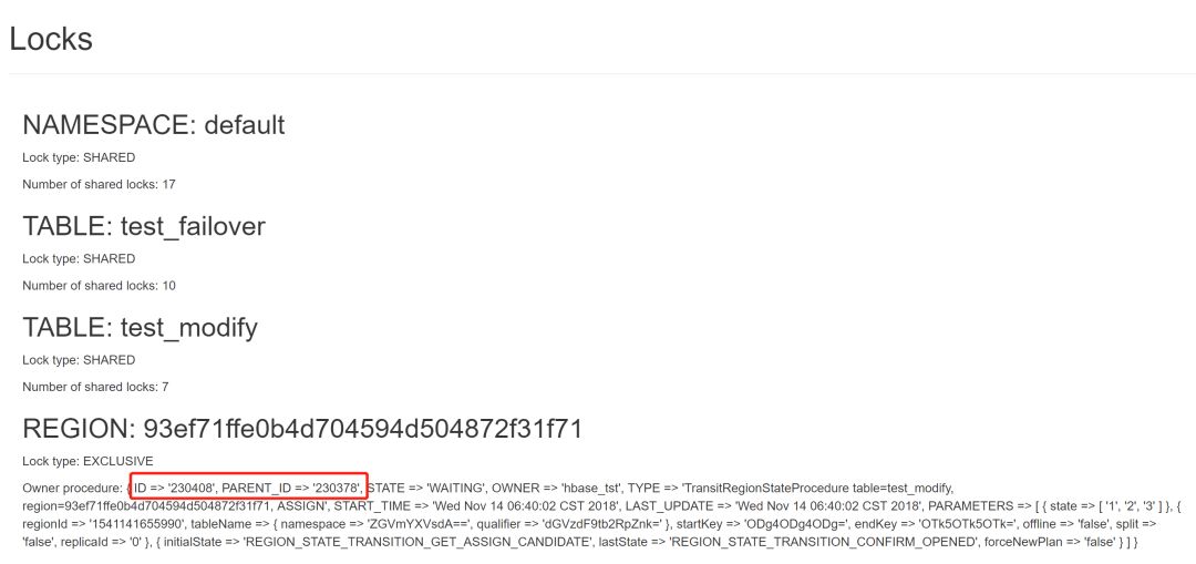 可以看到EXCLUSIVE的lock只有region级别的,图中红框圈出来的就是占有这个锁的procedure id以及它的parent procedure id, 由此我们知道如果想要重新assign/unassign这个region,那么一定要bypass这个procedure。