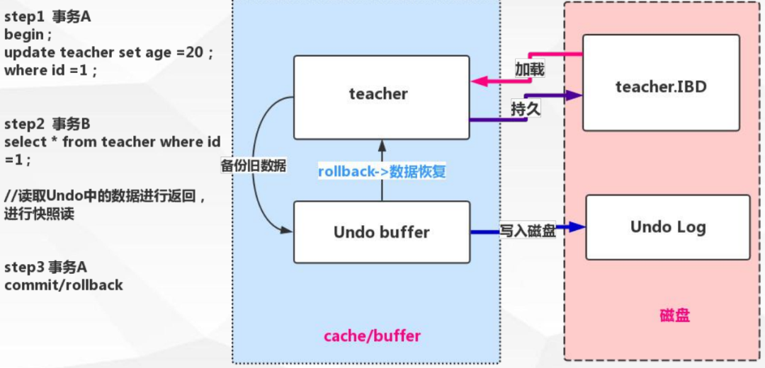 Undo log 实现多版本并发控制:事务未提交之前,Undo 保存了未提交之前的版本数据,Undo 中的数据可作为数据旧版本快照供其他并发事务进行快照读