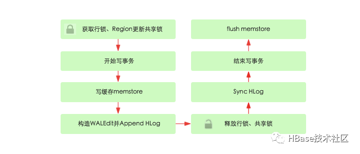 (1)获取行锁、Region更新共享锁: HBase中使用行锁保证对同一行数据的更新都是互斥操作,用以保证更新的原子性,要么更新成功,要么失败。