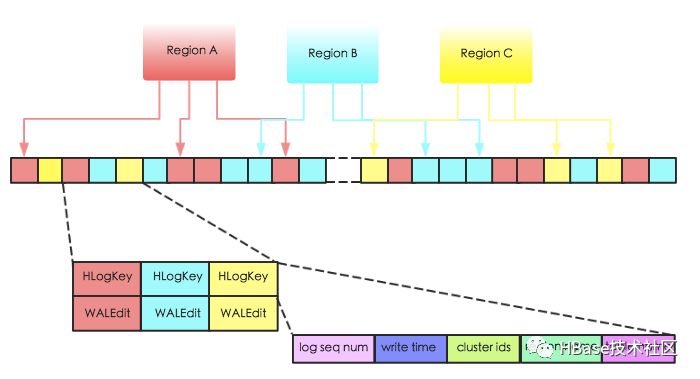 HBase中,WAL的实现类为HLog,每个Region Server拥有一个HLog日志,所有region的写入都是写到同一个HLog。下图表示同一个Region Server中的3个 region 共享一个HLog。当数据写入时,是将数据对<HLogKey,WALEdit>按照顺序追加到HLog中,以获取最好的写入性能。