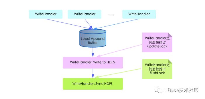 上图中,本地缓存写入文件系统那个步骤工作线程需要持有updateLock执行,不同工作线程之间必然会恶性竞争;不仅如此,在Sync HDFS这步中,工作线程之间需要抢占flushLock,因为Sync操作是一个耗时操作,抢占这个锁会导致写入性能大幅降低。