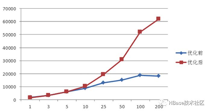 所幸的是,来自中国(准确的来说,是来自小米,鼓掌)的3位工程师意识到了这个问题,进而提出了一种新的写入模型并被官方采纳。根据官方测试,新写入模型的吞吐量比之前提升3倍多,单台RS写入吞吐量介于12150~31520,5台RS组成的集群写入吞吐量介于22000~70000(见HBASE-8755)。下图是小米官方给出来的对比测试结果: