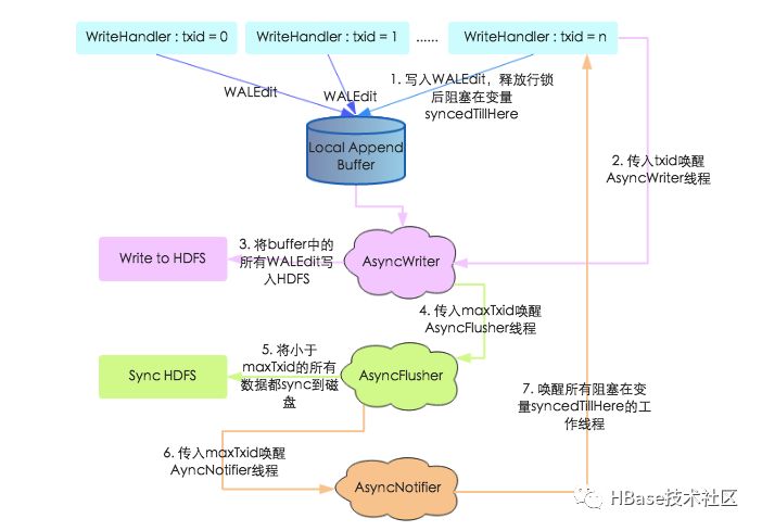 2. 工作线程将WALEdit写入本地Buffer之后,会生成一个自增变量txid,携带此txid唤醒AsyncWriter线程