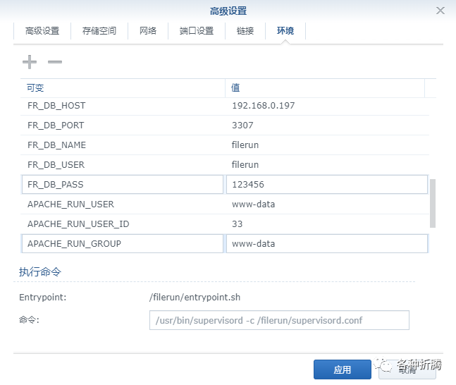 FR_DB_PASS | 数据库密码,默认为 filerun,改为你自己的数据库密码 |