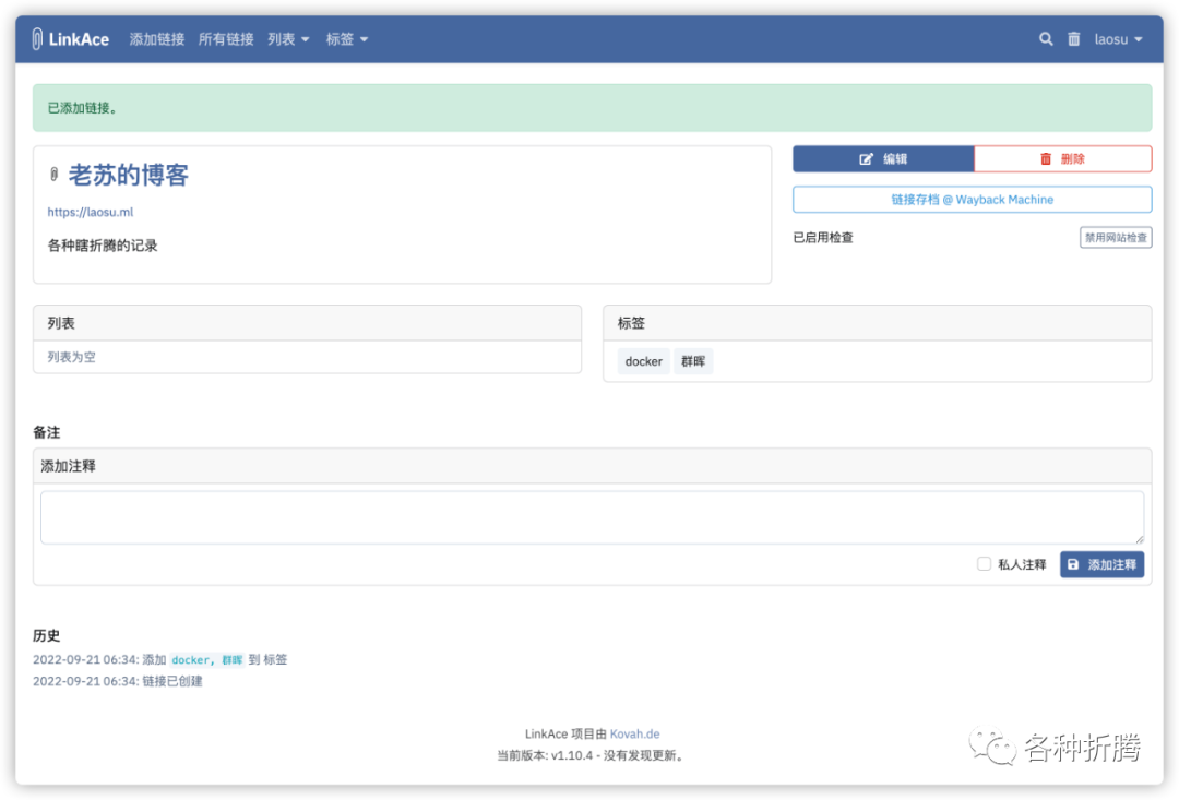 的链接。用户可以对添加的链接进行分类以便以后找到它们,并与朋友、家人或同事共享链接列表。但是,LinkAce