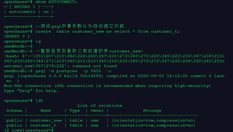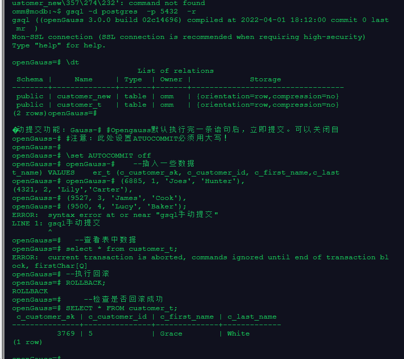 #Opengauss默认执行完一条语句后,立即提交。可以关闭自动提交功能: