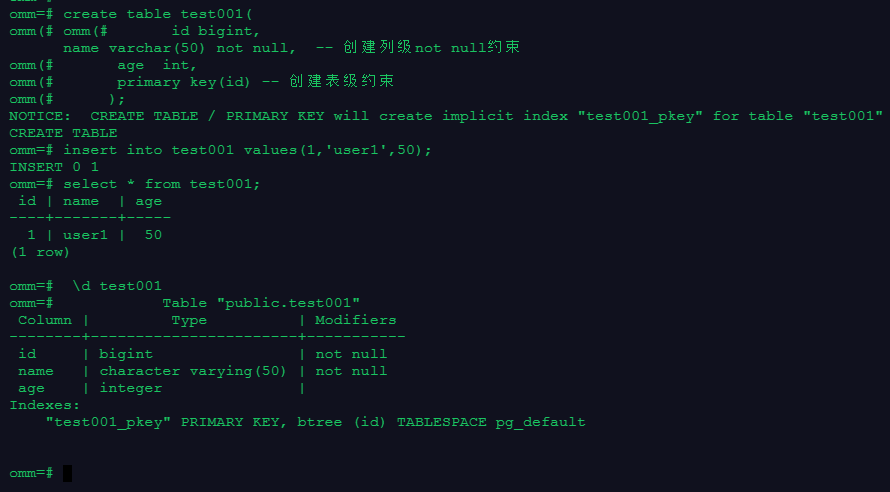 #这里在表列级定义了primary key约束(id列),在列级定义了not null约束(name列)。