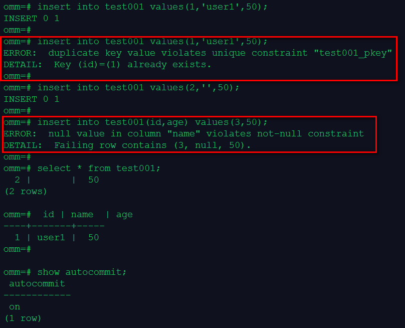 insert into test001 values(1,'user1',50); ## 会因为主键值冲突报错