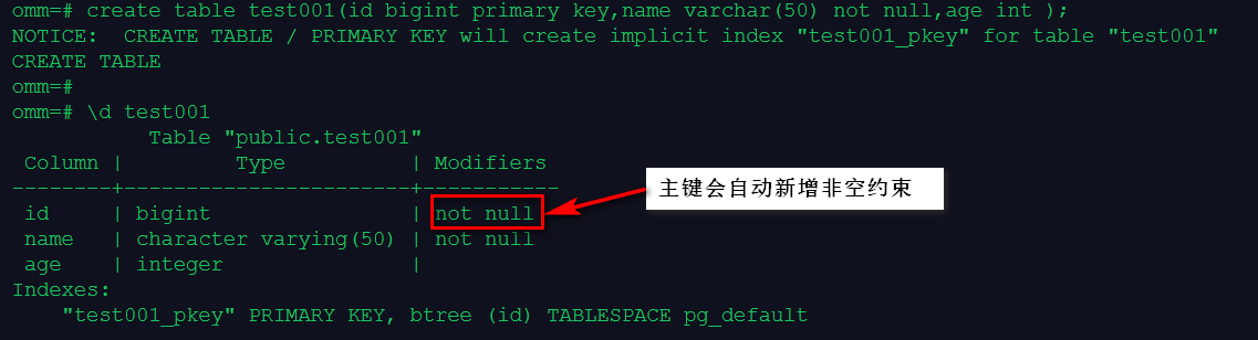 create table test001(id bigint primary key,name varchar(50) not null,age int );