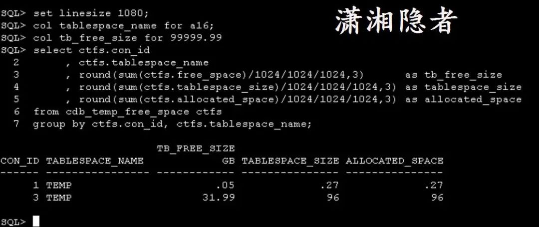CON_ID TABLESPACE_NAME GB TABLESPACE_SIZE ALLOCATED_SPACE
