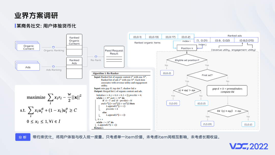 以某职场社交平台的方案为例。它将优化目标设定为在用户体验价值大于一定值的前提下最优化营收价值。对于待插入广告,将用户体验货币化,与商业化价值加权衡量整体价值。