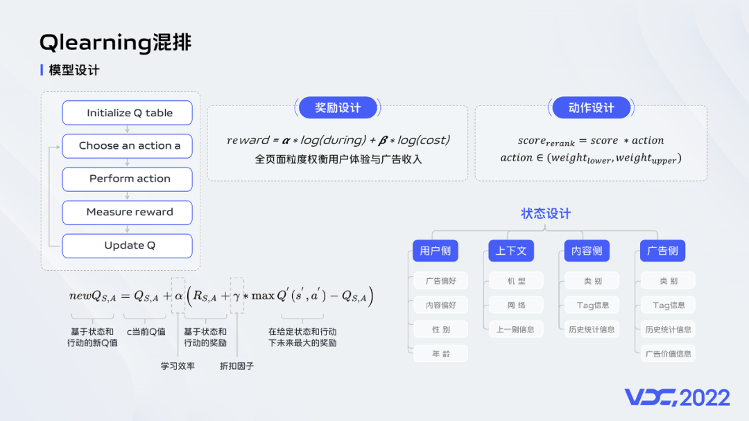 在状态设计上包含用户特征、上下文特征、内容侧特征和广告侧特征四个部分。像统计特征和上下文特征等对Qlearning模型有较大影响。
