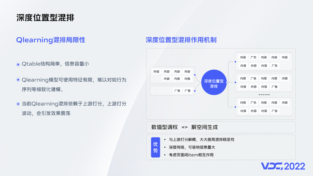 为了解决Qlearning的问题,我们研发了深度位置型混排。在混排机制上由原本的数值型升级为直接生成位置的位置型混排,而在模型本身我们由Qlearning升级成了深度学习。