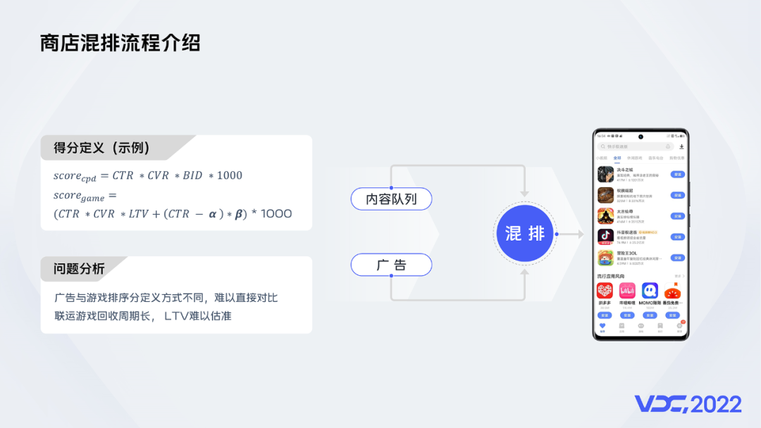 商店混排的核心问题是实现广告队列与游戏队列的混排。而就像图中所示广告与游戏排序分定义方式不同,难以直接对比。此外联运游戏回收周期长, LTV难以估准,即使全部按照ecpm排序也较难保证效果。