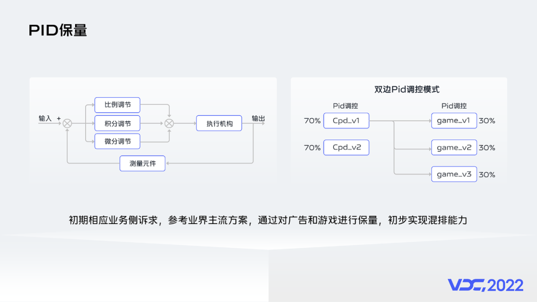 首先介绍PID的方案,PID最开始来源于自动化领域。初期为了相应业务侧诉求,参考业界主流方案,通过对广告和游戏进行保量,初步实现混排能力。但方案较为简单,且PID难以关联到收益目标,难以实现收益最优。