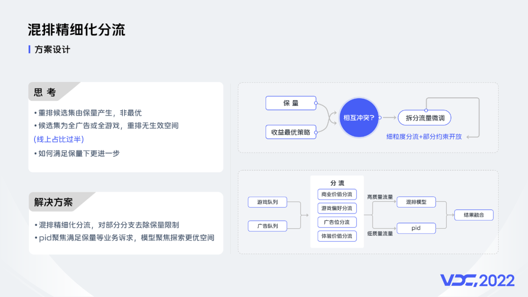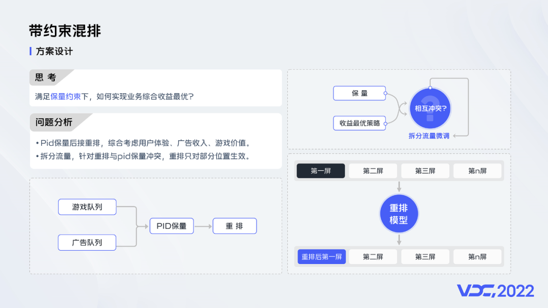 vivo商店混排采取流量拆分微调的思路,在PID保量后接重排,综合考虑用户体验、广告收入、游戏价值三者的平衡点。针对重排与PID保量冲突,重排只对部分位置生效,使得在部分流量如首屏下能够进行收益的探索,而又能满足保量需求。