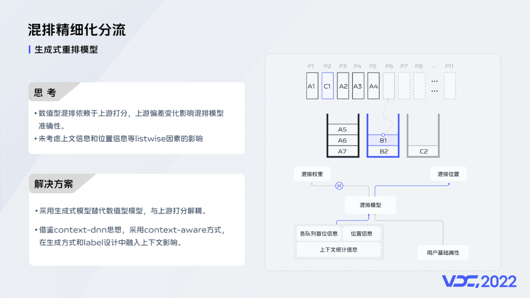 我们采用采用生成式模型替代数值型模型,直接生成混排结果,与上游打分解耦。