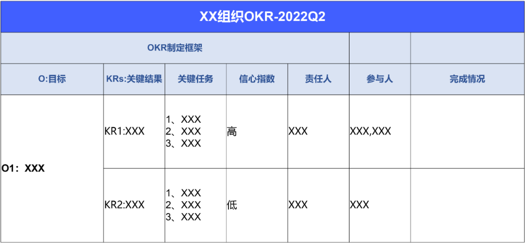 为了辅助成员更好的完成OKR的制定,可以在选择的工具基础上制定个模板。模板里面包含OKR的关键要素(信心指数、责任人等)即可。如图2-1是我们制定阶段的OKR工具模板,是用Excel承载的,入手毫无压力。