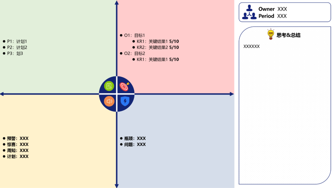 在跟踪阶段,除了“公开透明”、”多人协同”的原则是一定要保留的,你可以继续选择制定阶段的工具,持续地完成过程跟踪。当然也可以结合我们想达成的一些目标,针对性地做一些调整。在初期,我们期望培养责任人的owner意识,希望他们主动地刷新OKR进度;同时为了配合OKR氛围的建设,我们希望责任人能做一些思考&总结性质的工作,并将成果在团队内做一定的呈现,从而带动更多的人。为此我们制定了四象限图的跟踪模板,引导大家做内容成果上的挖掘。图2-2是我们跟踪阶段的OKR工具。