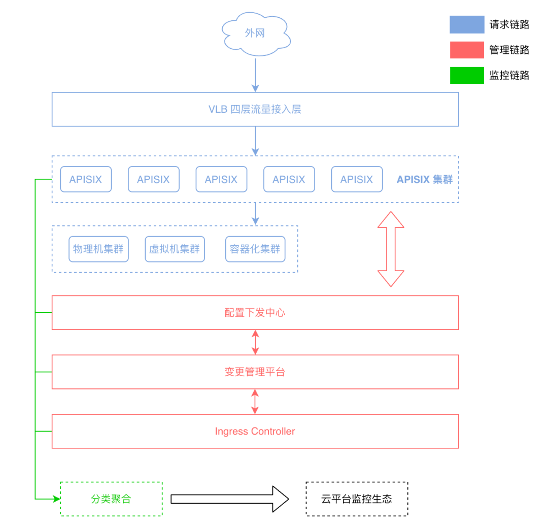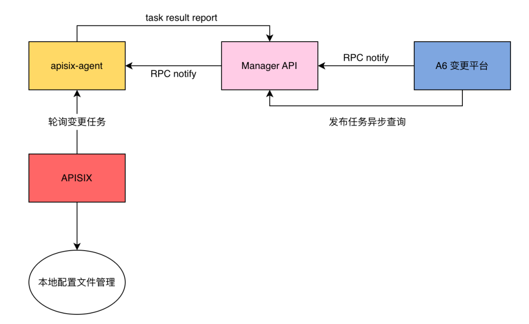 当业务从 APISIX 变更平台配置好相关数据后,变更平台会通过 RPC notify 的方式发送给 Manager API。之后 Manager API 会通过 RPC notify 方式发送给部署在 APISIX 集群中的 apisix-agent。然后 APISIX 会通过 privilege 特权进程,定时轮询 apisix-agent 去批量获取变更任务。之后 APISIX 通过共享队列的方式,由特权进程通知给各个实际的 worker 来实现内存上的变更。变更完成后,worker 会将相关的配置信息进行一个落盘处理。当整个任务完成后, APISIX 会把相关结果通知传送给 apisix-agent 并传递给 Manager API。本身这套流程是一个异步查询,对于配置是否完全生效或者任务是否成功,都是通过轮询接口进行查询。可以看到上述流程中,我们对开源 APISIX 进行了如下的变动:去掉 etcd 组件,自研实现了基于 APISIX 的 A6 配置管理系统。之所以去掉 etcd 组件,是因为 etcd 本身还是一个偏内存的数据库,不适用于多维度资源的查询;同时对于我们本身业务而言,etcd 的修改事件模式(主要是删除)具有不可重入性,一旦删除相关资源,就无法再进行重复性操作;最后就是考虑到单独增加一个系统组件(且处于核心地位),在大量 watch client 下的系统维护复杂度会大量增加,因此在我们的改造架构中删除了 etcd。在引入 APISIX 之前,我们团队对于 OpenResty 和 Lua 的使用经验基本为 0。所以考虑到已经去掉 etcd 的前提下,我们团队确实不具备能够改造 APISIX 核心底层技术的能力,所以通过自研 apisix-agent 组件,来简化现有 APISIX 的一些能力,降低我们内部使用上的一些复杂度,从而达到复杂性和稳定性之间的权衡。这一点主要是我们在设计时,希望数据面可以独立运行而不是去依赖于一个控制中心,减少连带影响。这样的话,当 APISIX 启动时就可以从配置中心全量拉取,也可以直接从本地落盘的文件目录进行拉取。在这种方案下,大大提高了数据面的独立性与系统的健壮性,同时对于问题的排查也带来了更清晰的路径展示。整个流程的后半段,其实都是在执行这种上报机制。之所以制作这种逻辑,是为了保障像路由和上游等核心资源的时效性。一旦出现那种你以为资源下发成功但实际没成功的现状,就必然会导致一段时间的流量影响。这套逻辑就可以保证 APISIX 上所有的 worker 都把需要的资源变动更新到了对应内存中。1.2 集群拆分管理改造