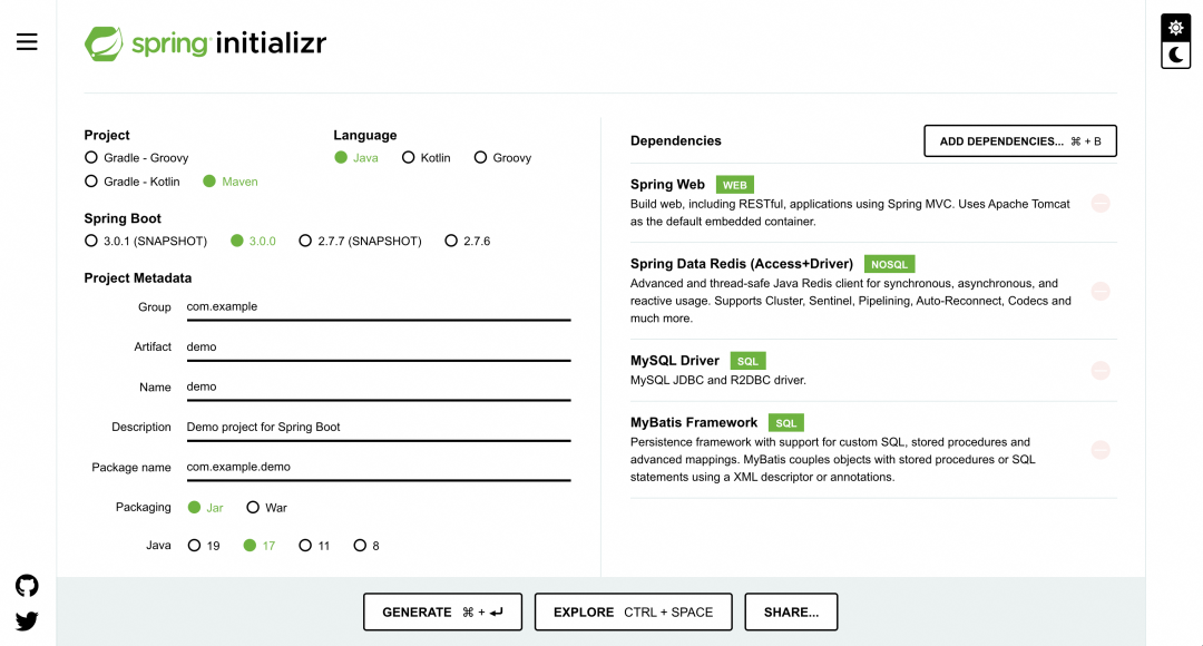 相比于手工项目构建时期的 Eclipse IDE,新阶段也有了新的更好用的 IDE——IntelliJ IDEA。相比于 Eclipse 单一的白色界面。IDEA 提供了炫酷的暗黑模式,让大量长时间写代码的工程师们缓解了用眼疲劳问题。由于 start.spring.io 工程脚手架的出现并与 IntelliJ IDEA 进行了整合。在 IDE 中新建工程、添加依赖仅需通过点击几下鼠标即可帮你生成一个所需的包含特定依赖的项目。在 https://start.spring.io 网站上进行工程创建: