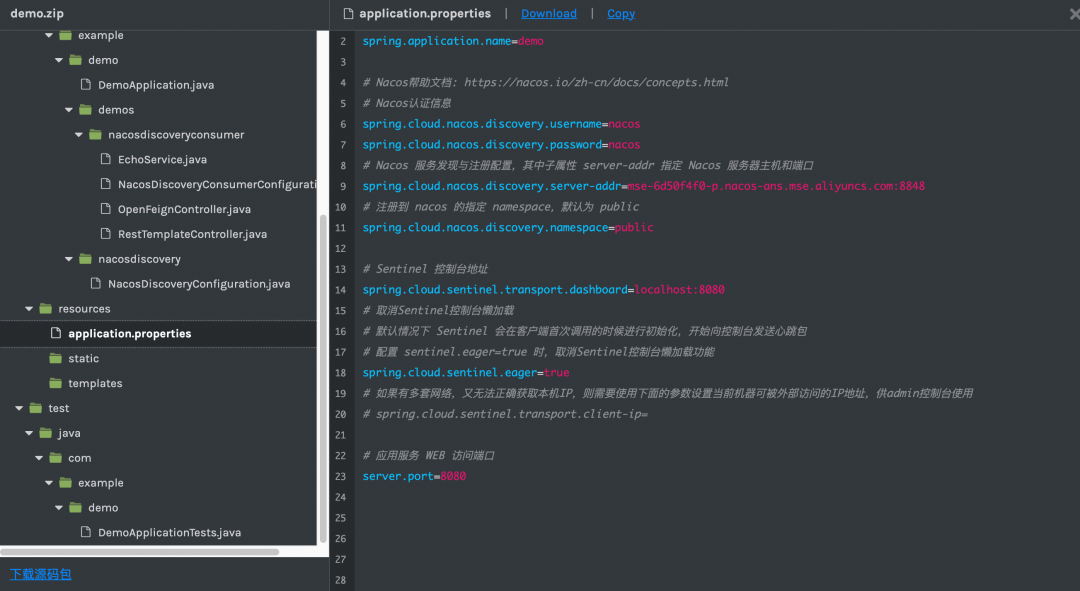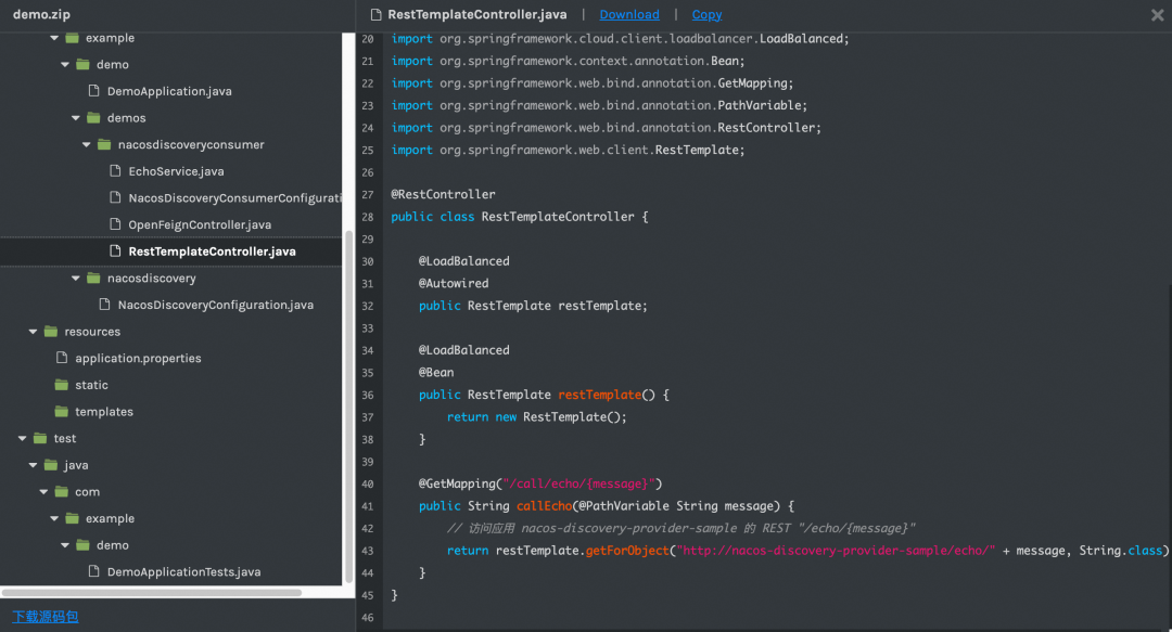 下图是一个 Spring Cloud Alibaba 工程使用 Nacos 作为注册中心,服务消费者项目构建过程中提供的示例代码: