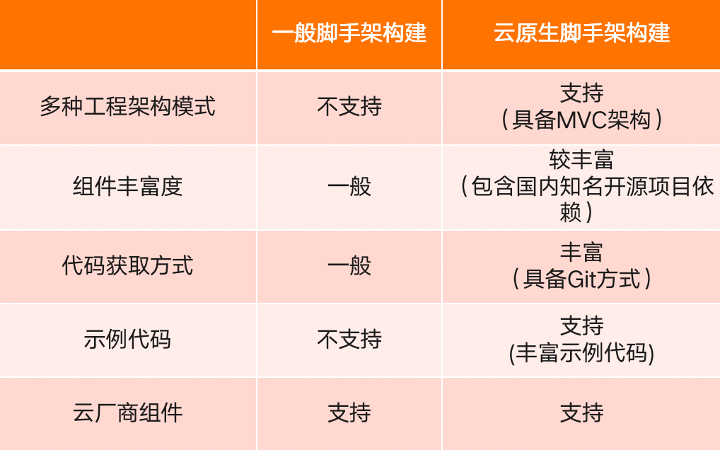 由于有脚手架帮助进行项目创建,脚手架本身已经帮助用户保证所选依赖之间具备兼容性,并且已经给出配置示例,用户仅需比如修改配置示例中的注册中心链接地址等信息,即可使用示例代码进行功能测试。整个过程实现了开箱即用的效果,用户再也不用关心如果新构建的项目依赖是否兼容、配置是否正确、示例代码如何编写等问题。帮助工程师们扫除一切项目构建阶段的障碍。最后,由于手动构建方式无论什么内容都需要用户手动设置或者添加,跟脚手架方式比不具备优势。因此,我们仅小节对比一下一般脚手架构建和云原生脚手架构建项目之间的区别和差异: