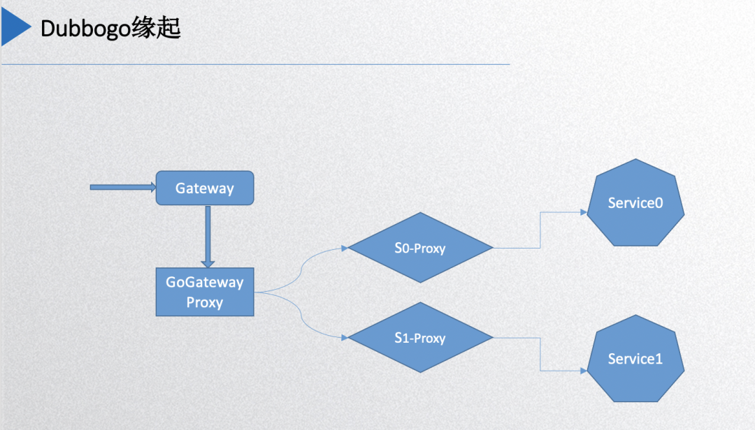 dubbogo 社区发展 7 年多,dubbogo 登记用户已达 63 家【详见 https://github.com/apache/dubbo-go/issues/2 】,真实用户应该更多。于某在支持某 dubbogo 用户时,曾提议让他们登记下,对方暗示自己的业务是金融 P2P,登记着实不便。如 链家 这种已知未登记用户,那就更多了。不少人曾问于某,到底是 dubbogo 还是 dubbo-go 才是正确拼写,个人通常的回答是,两个都对。于雨 2016 年 3 月在位于上海张江的 张衡路与华佗路 交叉口的 盛大研发中心 工作时,公司大部分项目使用了 Java 技术栈,其中相当数量的服务使用了已经无人维护的 Dubbo v2.5.4-snapshot。公司老板陈大年【内部称呼 年总】觉得云原生时代来了,让大家用 Go 语言改造公司的 Java 项目。于是公司新项目纷纷使用 Go 进行构建,但面临一个很重要的问题:Go 语言服务与 Java 服务之间如何进行通信?子曰,没有什么服务解耦是一层代理解不了的,如果一层不够,再来一层。如上图,刚开始大家给出的解决方案就是:- 有旧的 Java 服务,如 Service0,则先再构建一个 Service0 的代理 S0-Porxy,实现公司内部通信协议与 Dubbo 服务通信协议的转换;