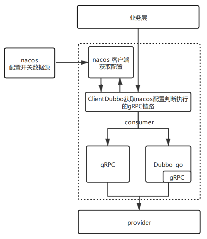 新系统开发完成后,从稳定性出发在生产环境进行灰度发布,逐步将流量接入 Dubbo-go。基于 Nacos 配置中心,将原 gRPC 客户端和 dubbo-go 的客户端封装成一个统一入口(简称 ClinetDubbo),它根据 Nacos 配置判断具体通信链路。在切换过程中,通过 Nacos 的配置逐步灰度调整线上流量,做到出问题时可实时回滚。