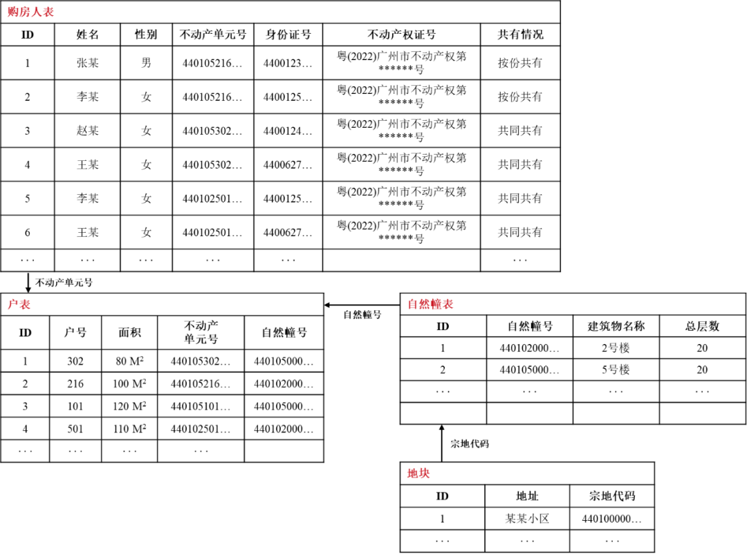 而在不动产数据库中,上述信息可能分布在购房人信息表、自然幢属性表、户属性表、房地产权属性表、抵押权属表等多个库表中。用户每一次查询都需要在上述的多张数据表中按照关联字段逐一跨表查询(如图1所示),这种操作在数据库中是非常耗时的。