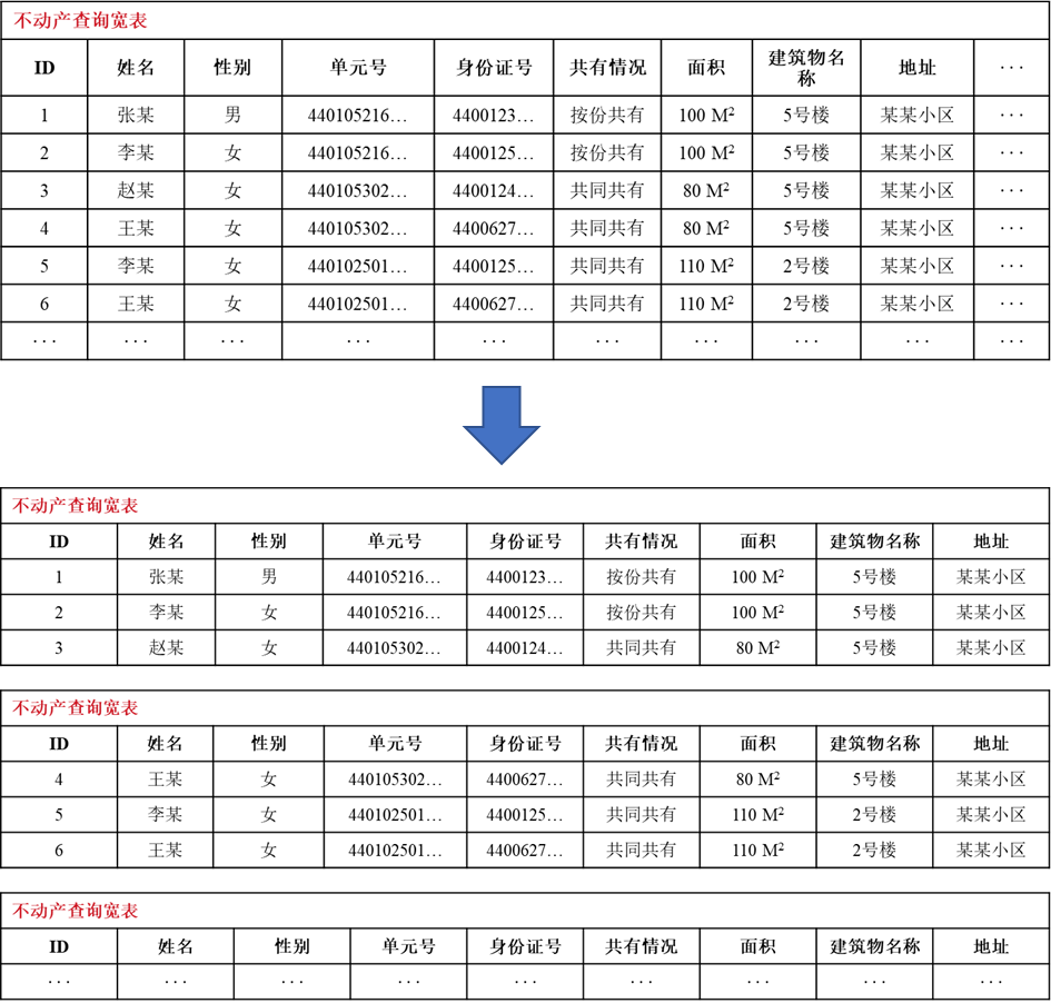 如利用唯一ID、业务主键、行政区划等字段,将数据表拆分为多个子表,从而实现数据在物理上的分区。例如将不动产查询宽表,按照ID序号,拆分为3张数据库表,查询时多个子表同步查询,查询更快,提升宽表查询效率。