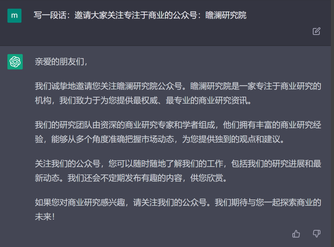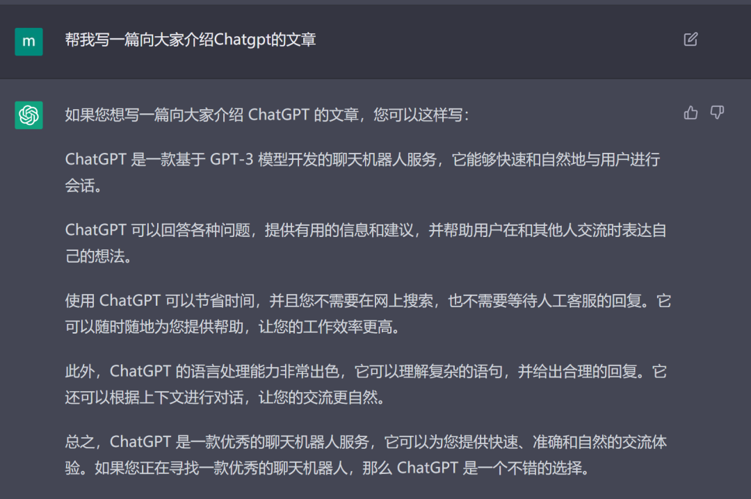 譬如,如果现在我想要为我们的读者介绍ChatGPT,我就可以就这个问题直接咨询ChatGPT: