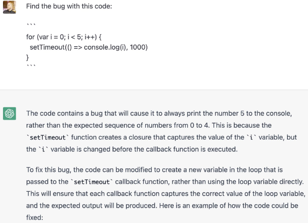 技术公司Replit的创始人给ChatGPT发了一段JavaScript代码,让它找到里面的bug。ChatGPT 的回答非常全面也非常有意思:它首先试图确认这段代码的意图是什么,然后根据意图很快就找到了 bug 所在,并且还附上了相当细致的描述,来解释问题出在哪,会导致什么样的 bug,应该怎么改,为什么要这样改等等。