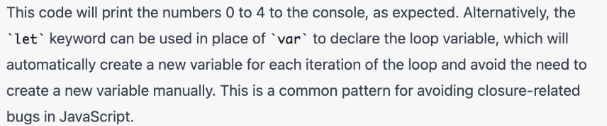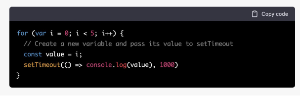 最后,ChatGPT 还提供了一小段修改建议:“可以把 var 换成 let,让循环每次迭代的时候自动生成新变量,从而避免每次都要手动创建。”